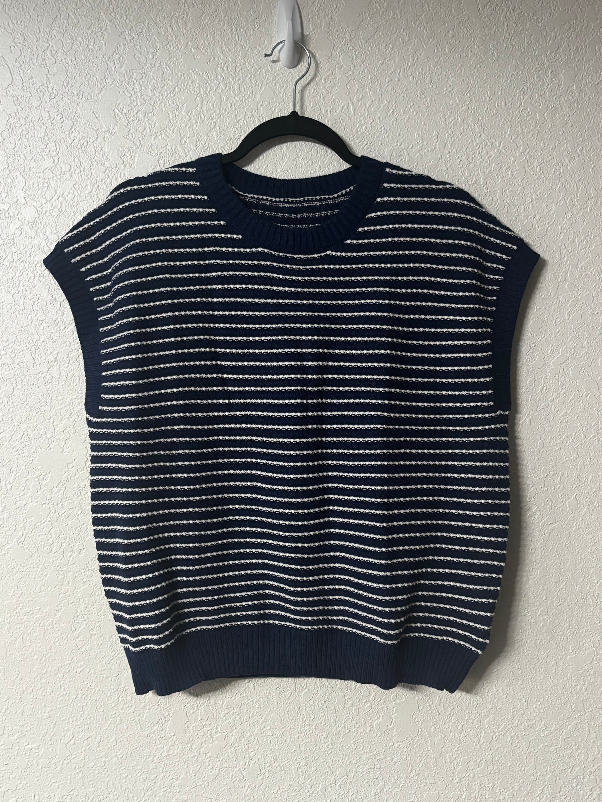 Effortlessly classic and endlessly versatile, the Neva Sleeveless Sweater is the perfect layering piece for every season. Designed in a navy and white horizontal stripe knit, it features a relaxed fit with ribbed trim at the neckline, arm openings, and hem. The soft, textured knit adds a touch of coziness without being bulky, making it easy to dress up or keep casual.